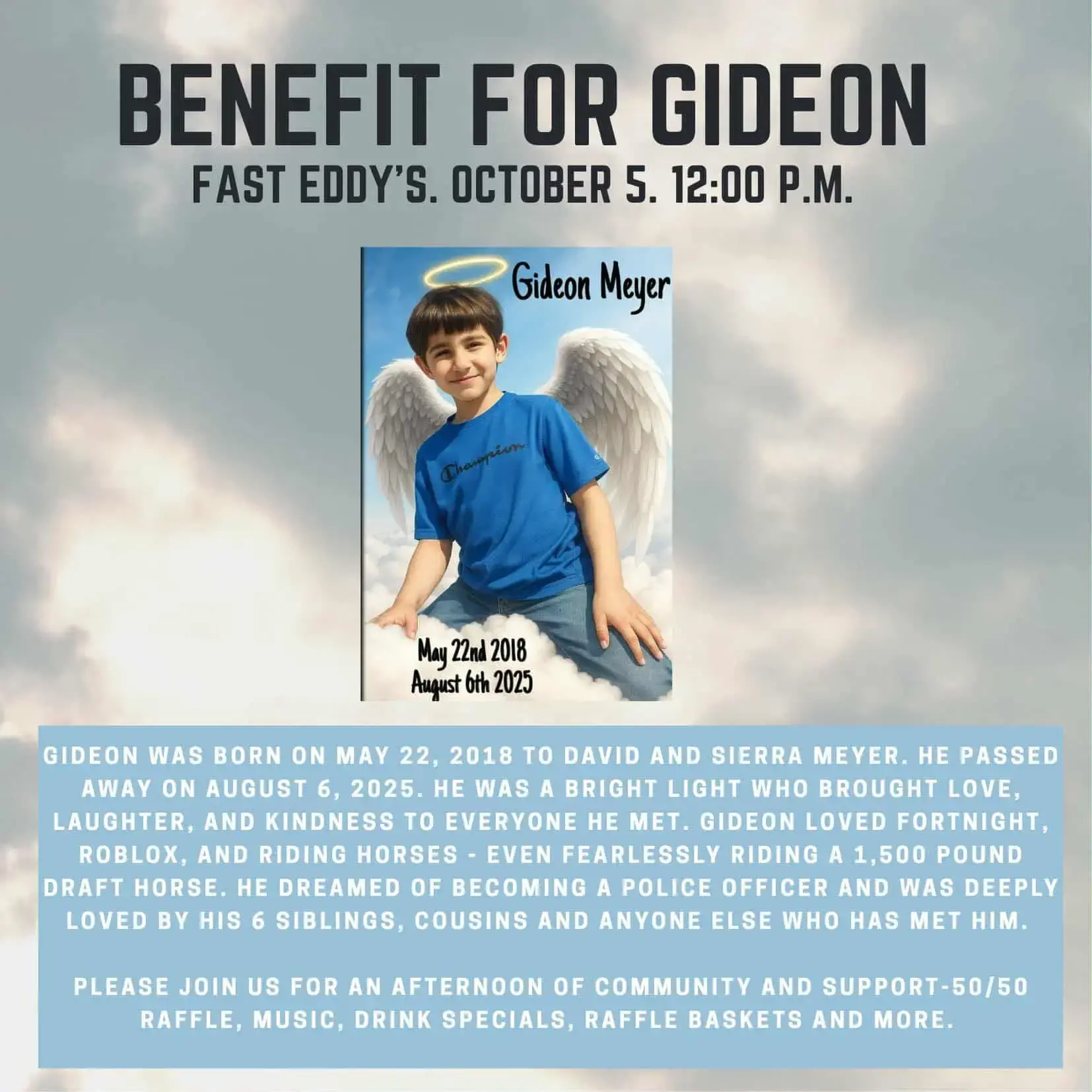 Gideon Bronson Meyer was born May 22cd 2018. And was tragically killed on August 6th 2025. He was hit by car trying to cross the road to come home after playing with his friends like he did almost everyday. Gideon was our rainbow baby after having lost three babies. He was the kindest most beautiful soul that we are so thankful to have had for the short time we did. Gideon was so very loved by so many. He loved life and lived everyday to its fullest bringing joy and laughter wherever he went. He has 6 other siblings that are completely devastated by his loss. The house we live in is so quiet without his antics playing video games or playing with his toys. Gideon will live on through us and we will do our best to honor his legacy and try to live life like he did. We invite everyone to attend this very special event to honor our beautiful boy and help support our family through this very difficult time. Thank you all and we hope to see everyone there!