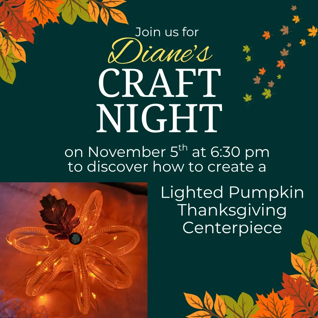 Join us for Diane’s Craft Night on November 5th at 6:30 pm to discover how to create a lighted pumpkin Thanksgiving Centerpiece. Can’t make it? No worries! You can collect a kit from the library anytime during November and enjoy crafting this project whenever it suits you!