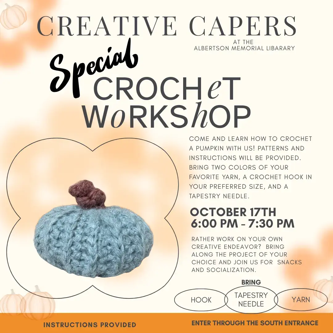 The Albertson Memorial Library is hosting a special Creative Capers Crochet Workshop on October 17th from 6 to 7:30 pm. Come and learn how to crochet a charming pumpkin with us! Instructions and poly-fil will be provided. Please bring two colors of your favorite yarn, a crochet hook in your preferred size, and a tapestry needle.