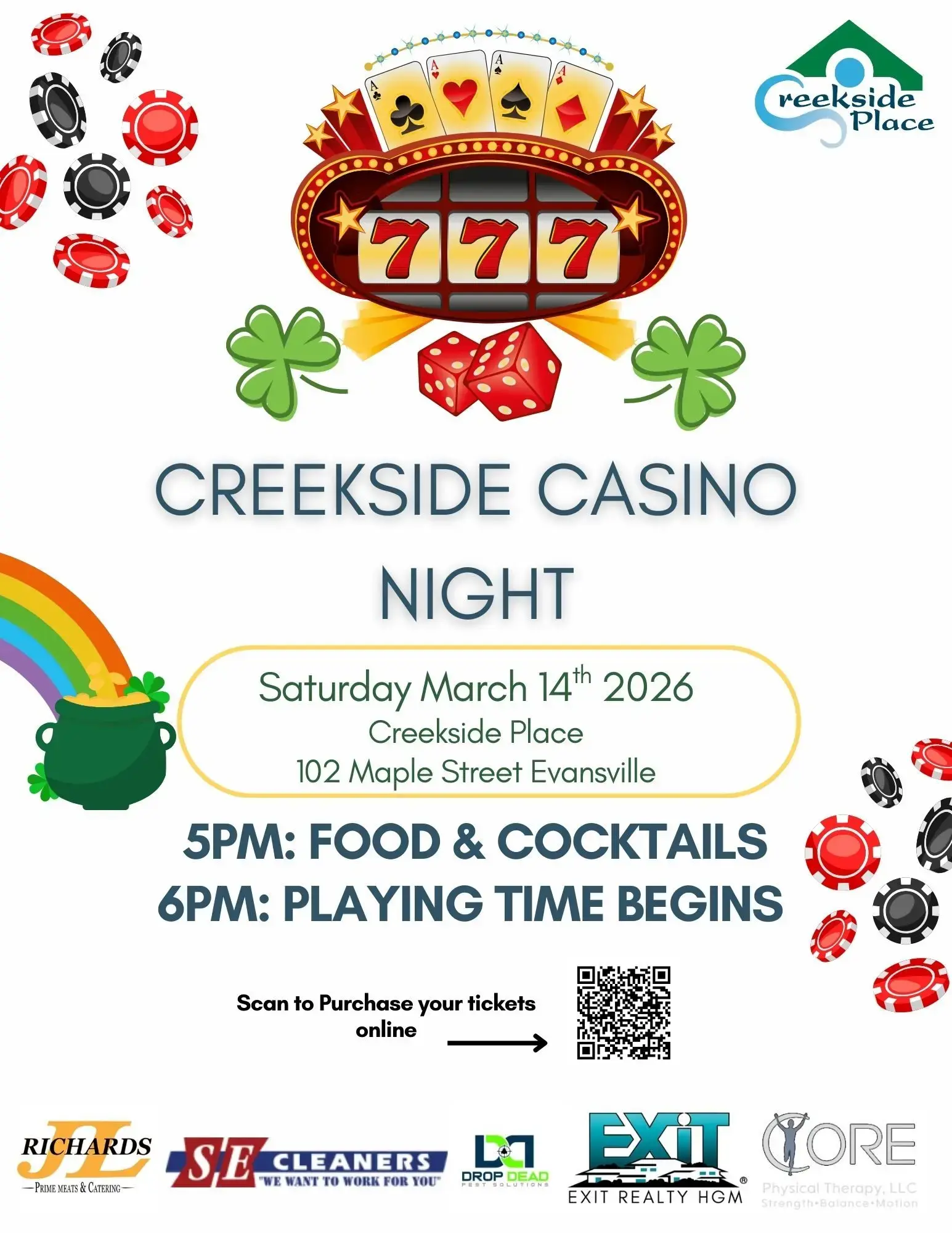 Whether you’re feeling lucky or just looking for a great night out, come help us chase the rainbow to our Pot of Gold Casino Night at Creekside Place!”