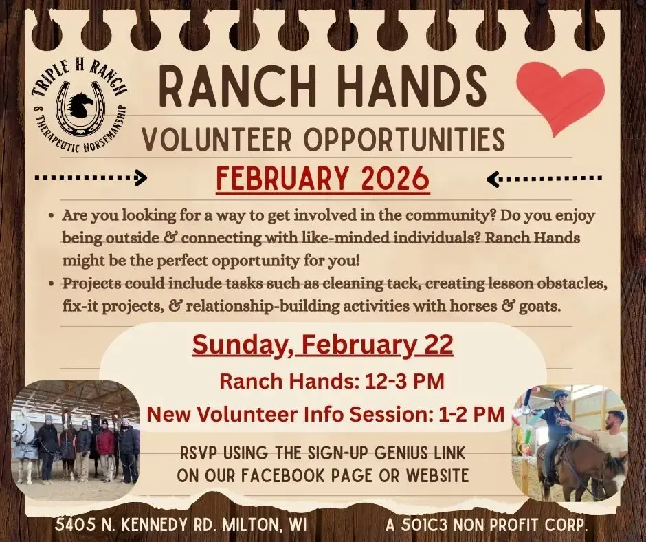 Do you like to be outside? Come check out the volunteer opportunities at Triple H Ranch & Therapeutic Horsemanship, a non profit organization in Milton! Learn to work with the horses, be an assistant to students with special needs, use your handy skills or help clean & organize the barn & supplies! Everyone welcome!