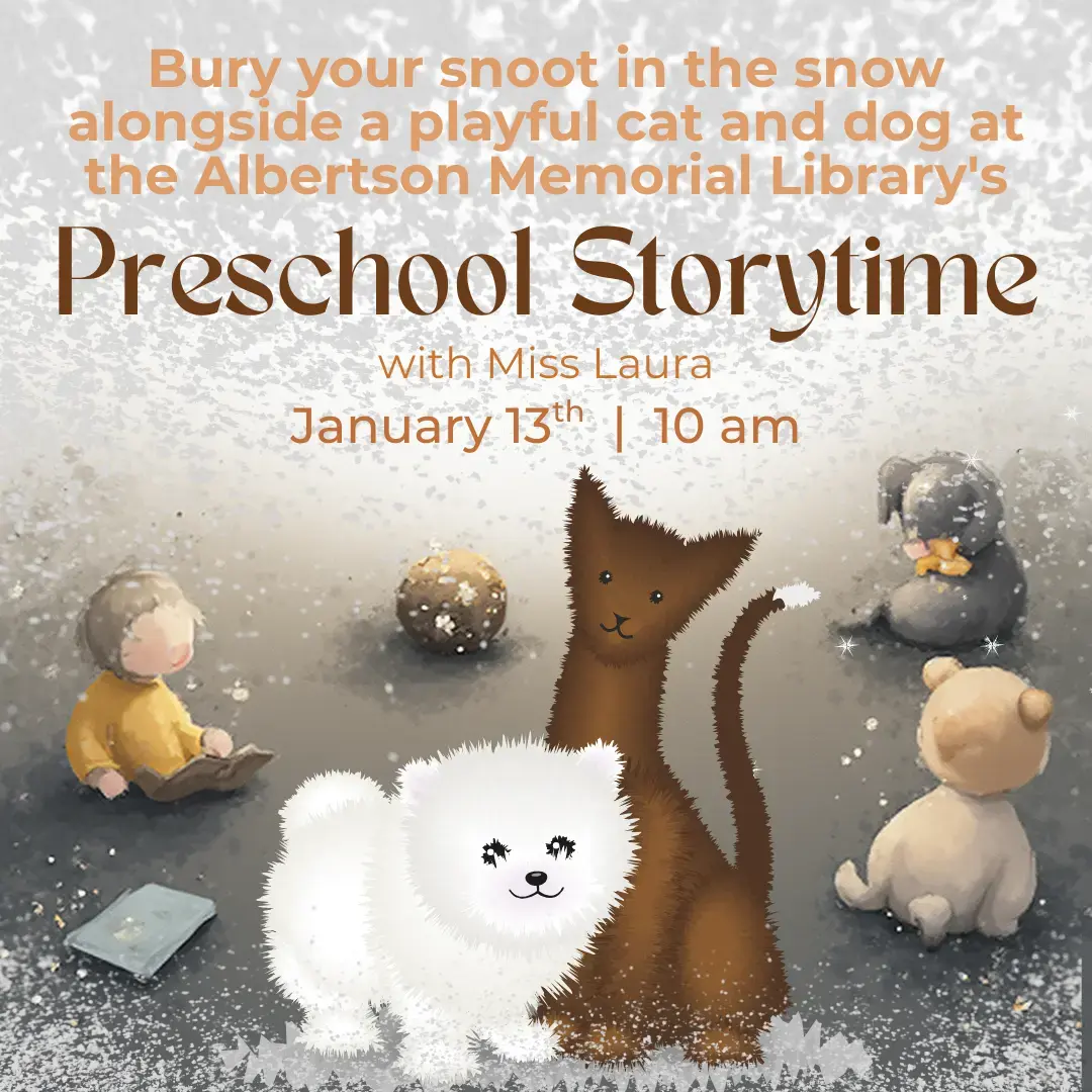 Bury your snoot in the snow alongside a playful cat and dog at the Albertson Memorial Library’s Preschool Storytime with Miss Laura on January 13th at 10 am.