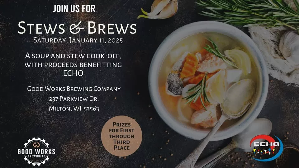 Join Good Works Brewing Company for Stews & Brews 2025, benefiting ECHO of Janesville. It’s free to enter our soup and stews competition and prizes will be awarded to First, Second, Third, and Judges’ Choice! Just follow the link below on the GWBC Facebook page to register your entry and then show up at Good Works Brewing with approximately 6-8 quarts (about the size of a standard slow cooker) of soup or stew for the public (and our judges) to sample. Attendees will vote on their favorite and prizes will be awarded at 3:15pm.