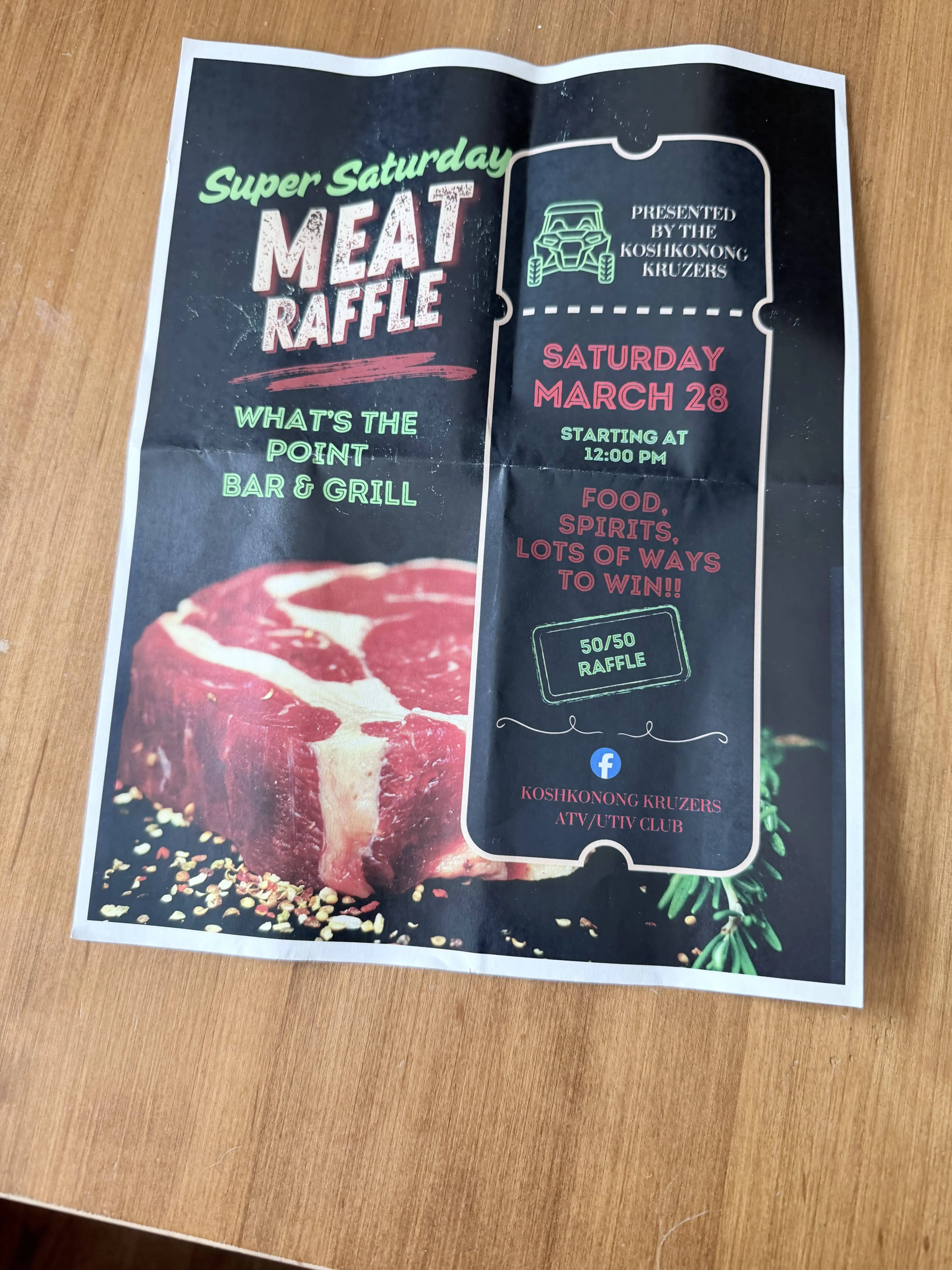 Meat and 50/50 Raffle event is presented by the Koshkonong Kruzers ATV/UTV Club This event will be held at What’s The Point Bar & Grill located in Fort Atkinson. Food, spirits, lots of ways to win!