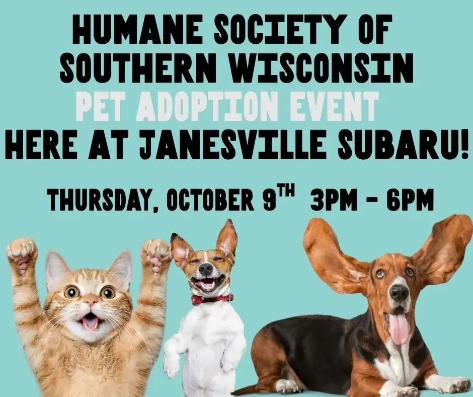 Staff & Volunteers will be set up with adoptable dogs and cats ready to find their fur-ever homes at Janesville Subaru from 3pm-6pm on October 9th!...